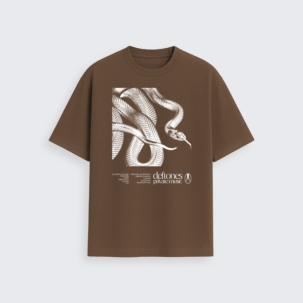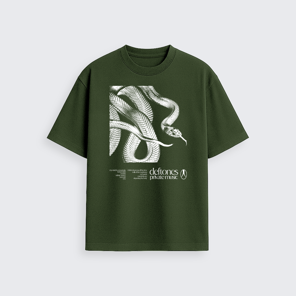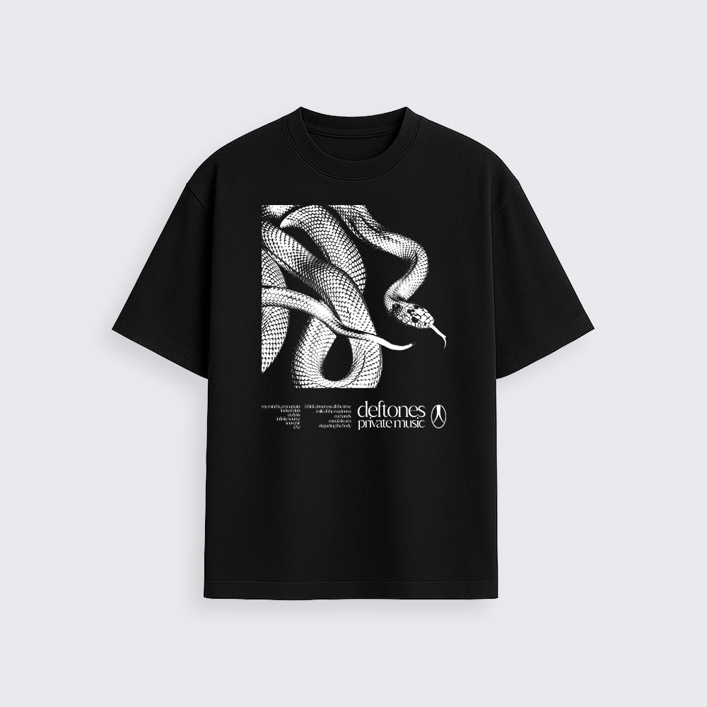Na frente, a estampa exclusiva traz a arte da serpente com o tracklist, traduzindo a atmosfera intensa e única do Deftones em um design imponente.