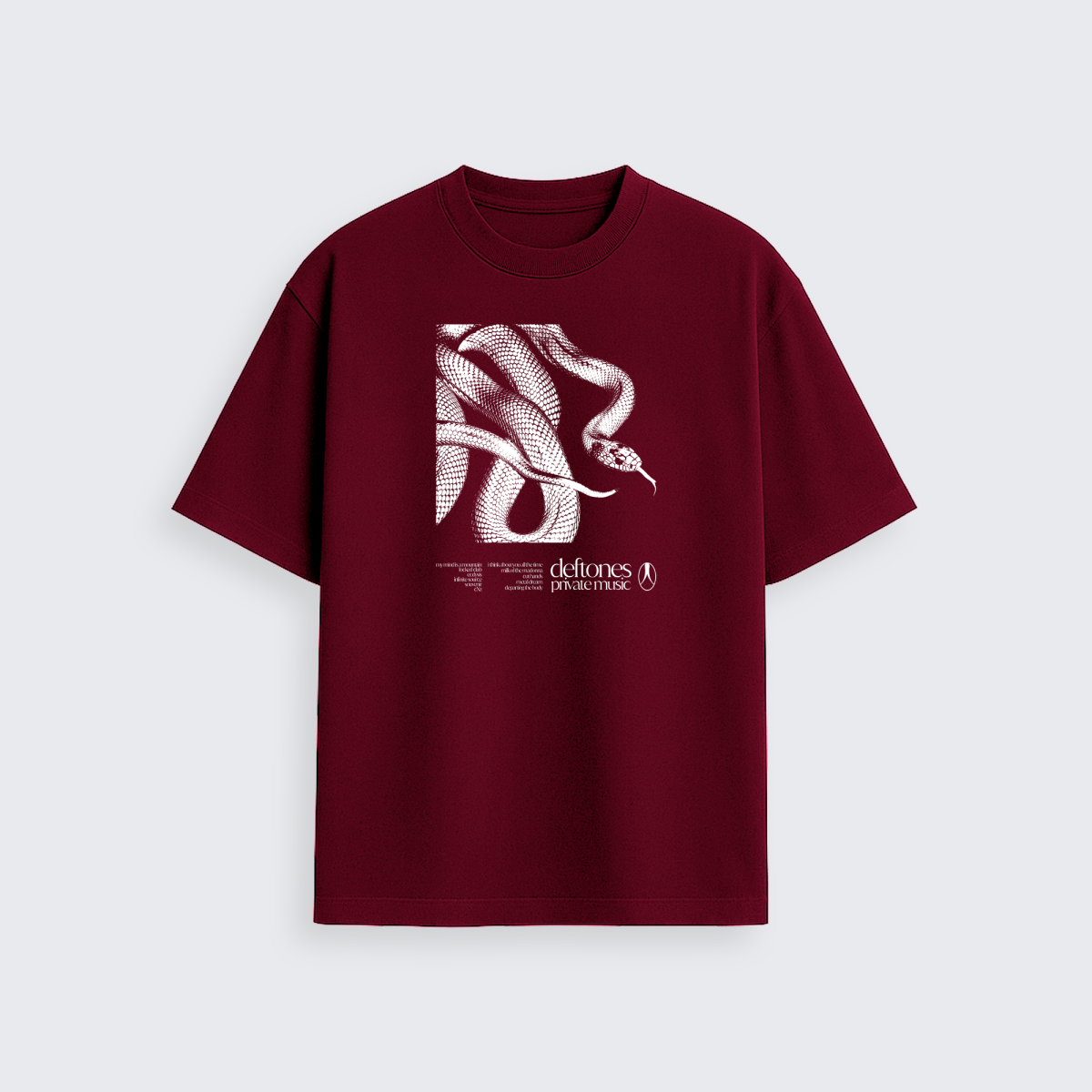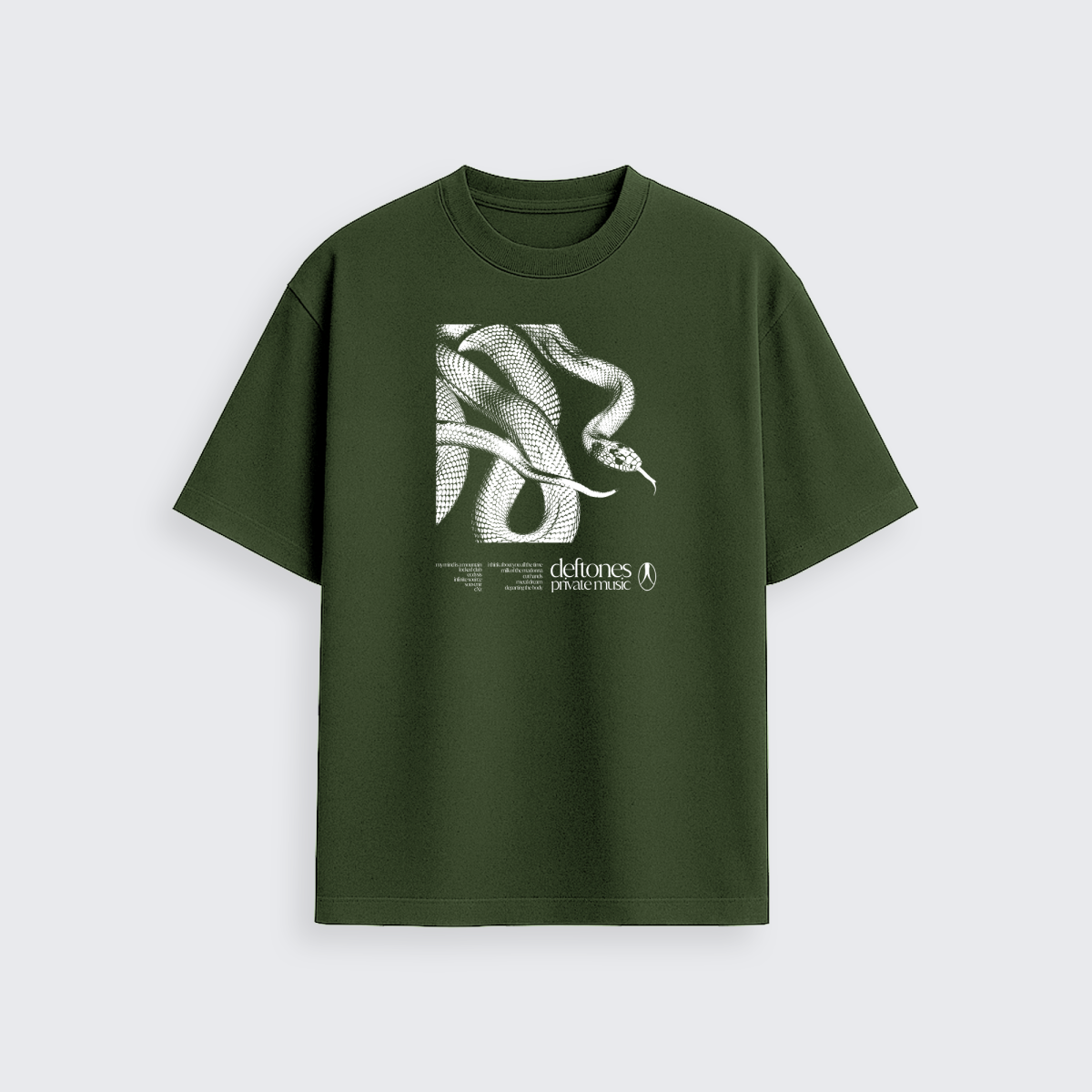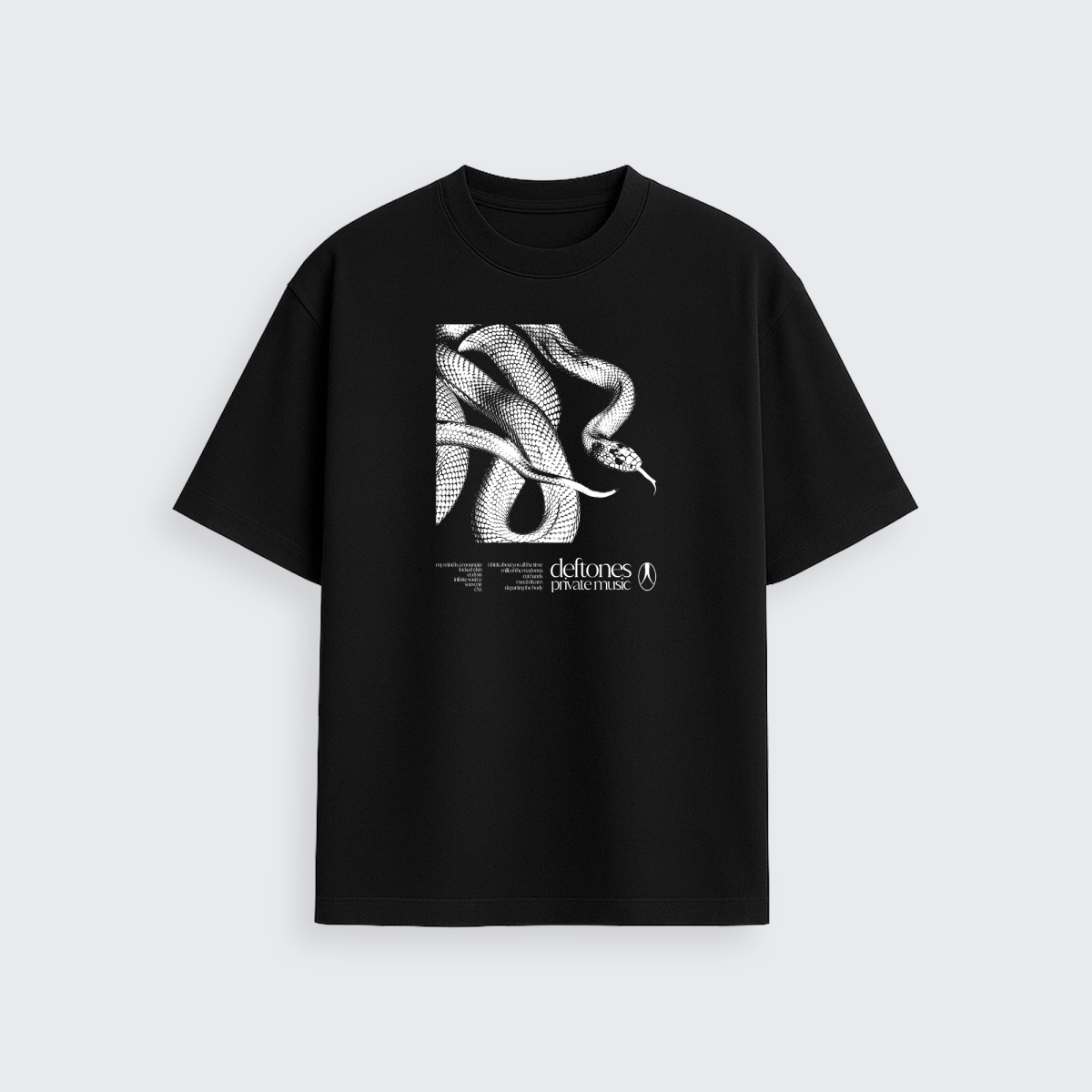 Na frente, a estampa exclusiva traz a arte da serpente com o tracklist, traduzindo a atmosfera intensa e única do Deftones em um design imponente.